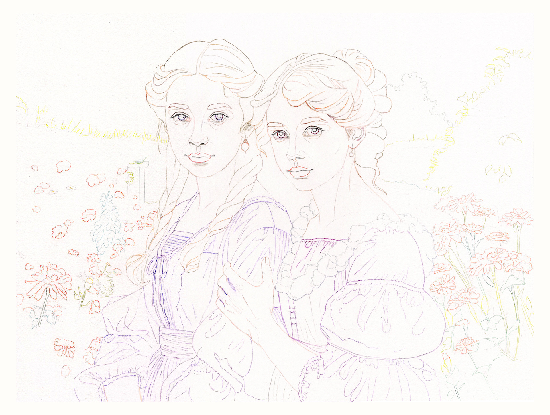 Lana and Esme in the Garden undersketch 2025